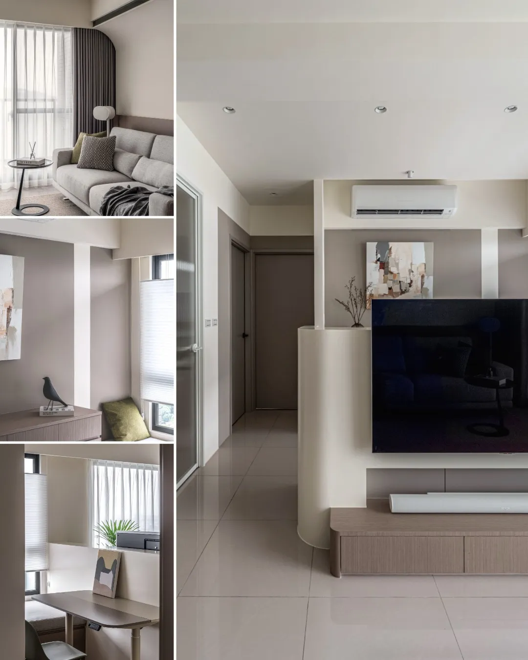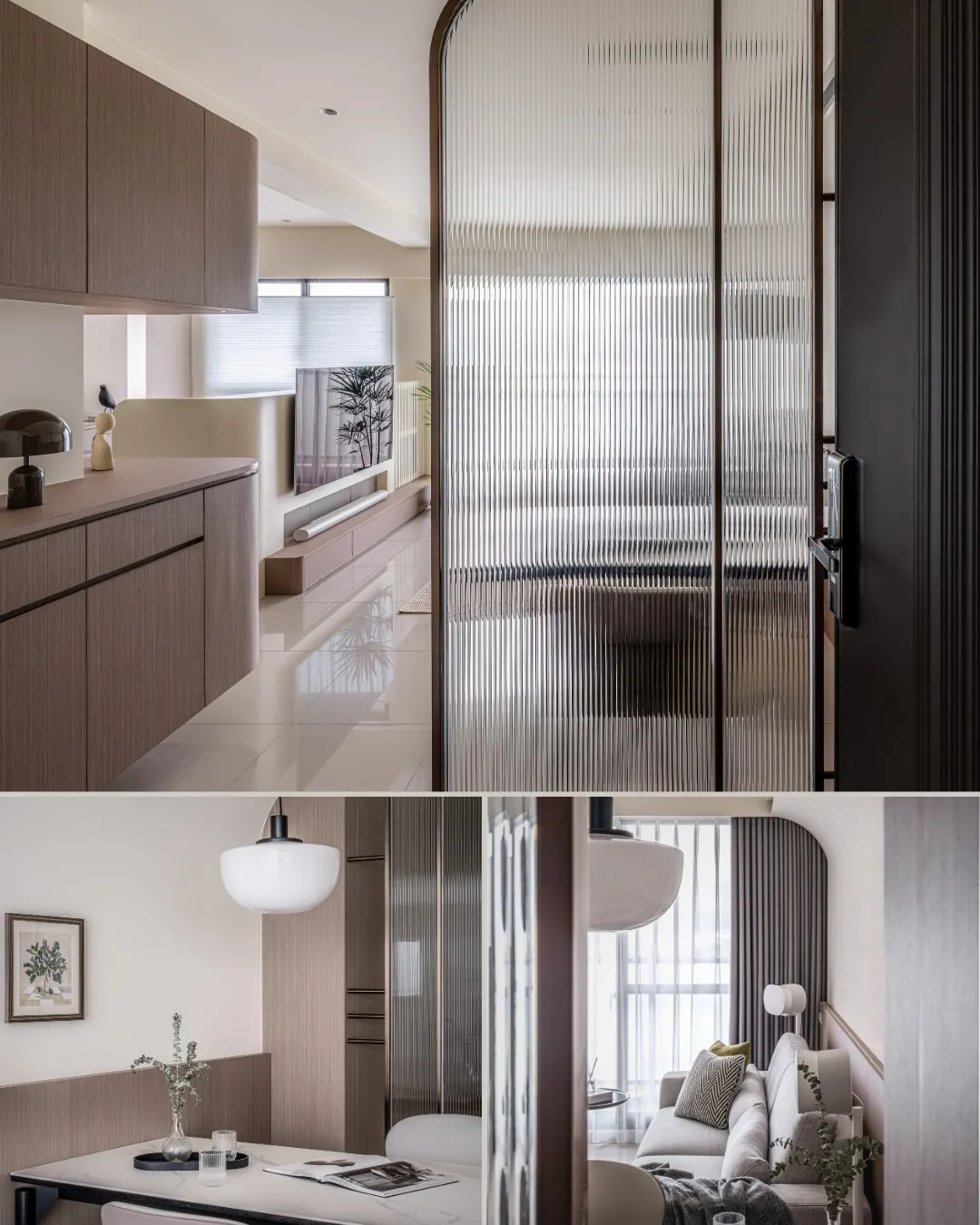 金屬框屏風界定玄關與客廳,在隱與透之間,保留恰好的距離。光線穿過細緻的長虹紋理,使邊界漸層柔化;半高電視牆相連書房與客廳,視線得以延展,空間彼此連結,卻不相擾
