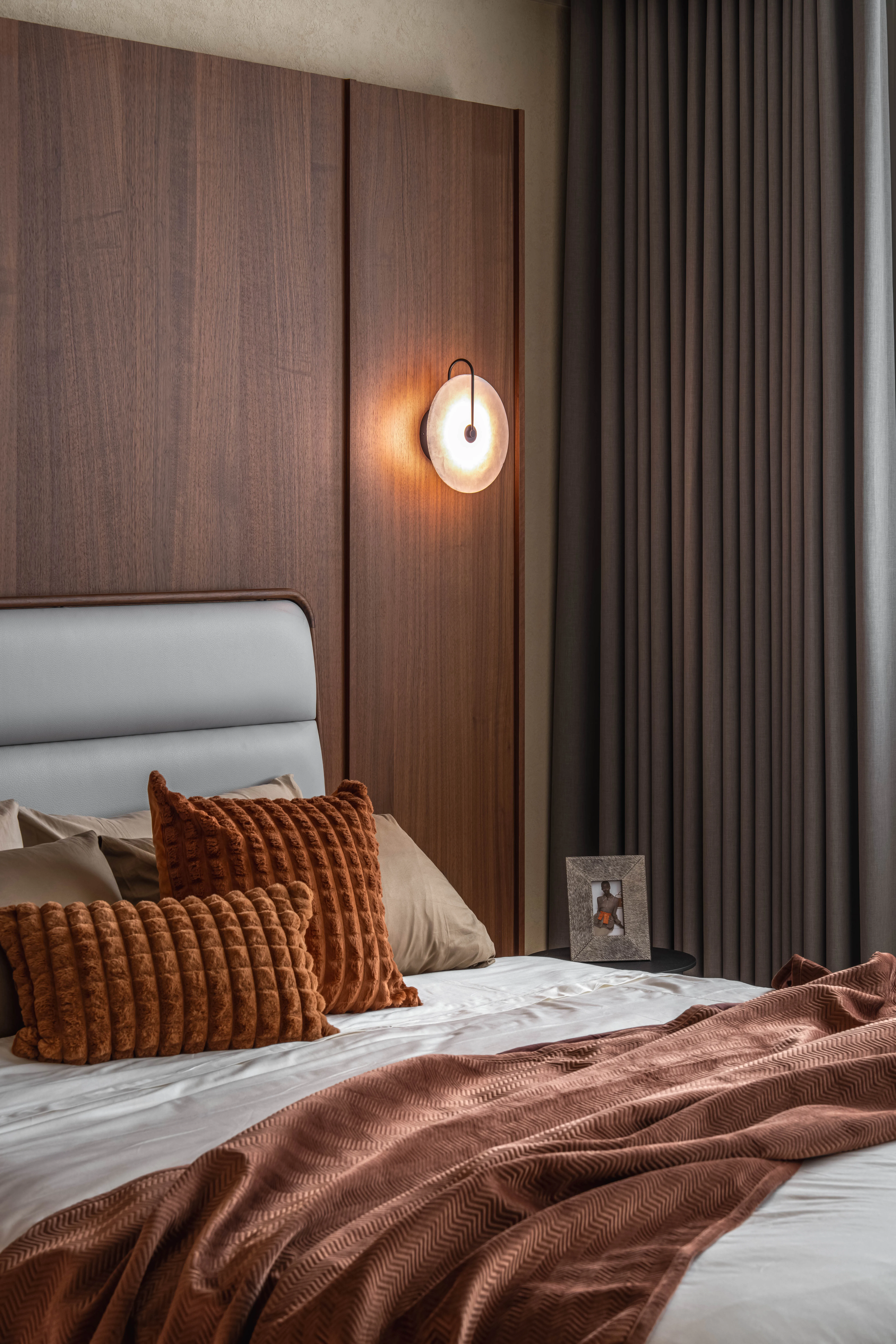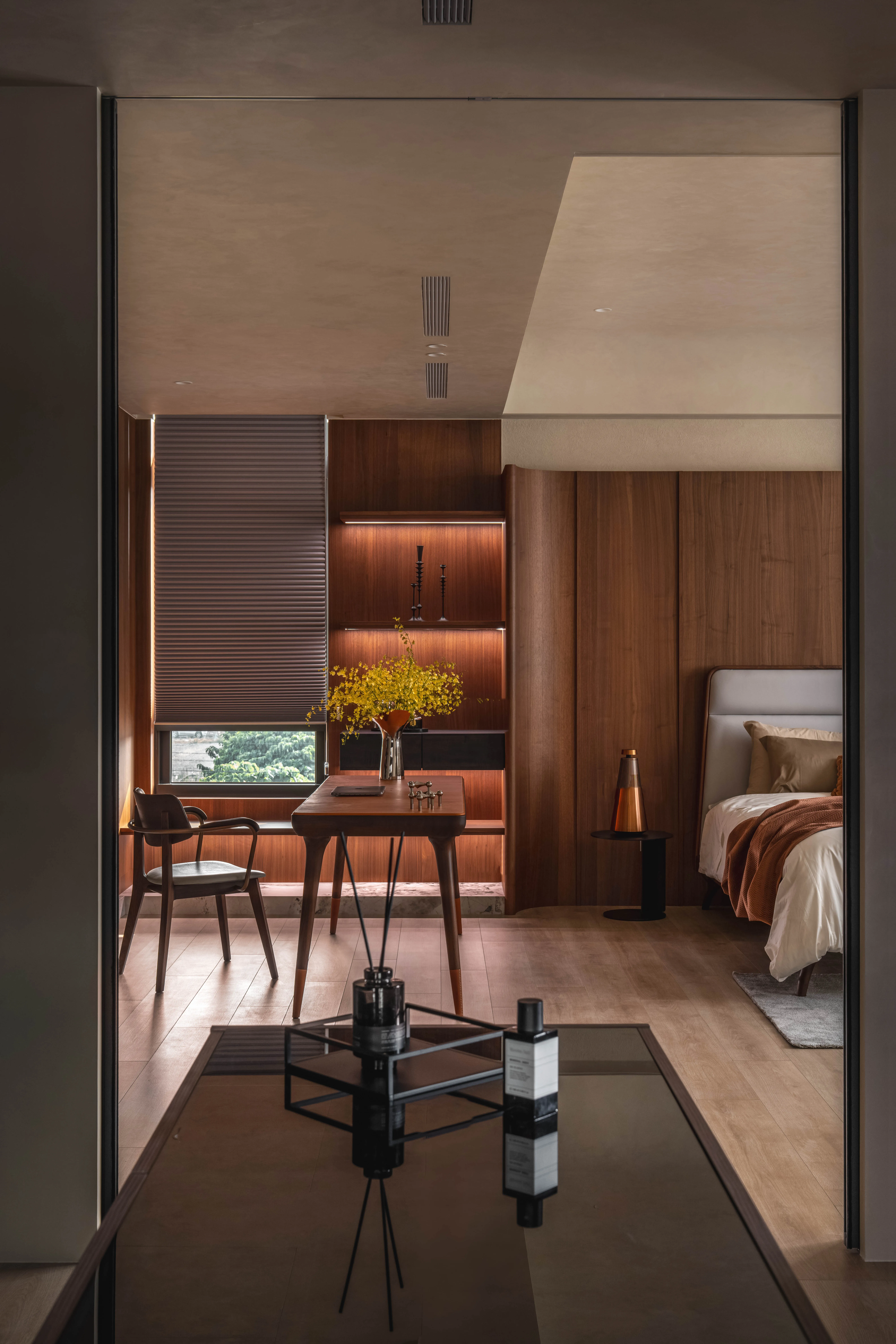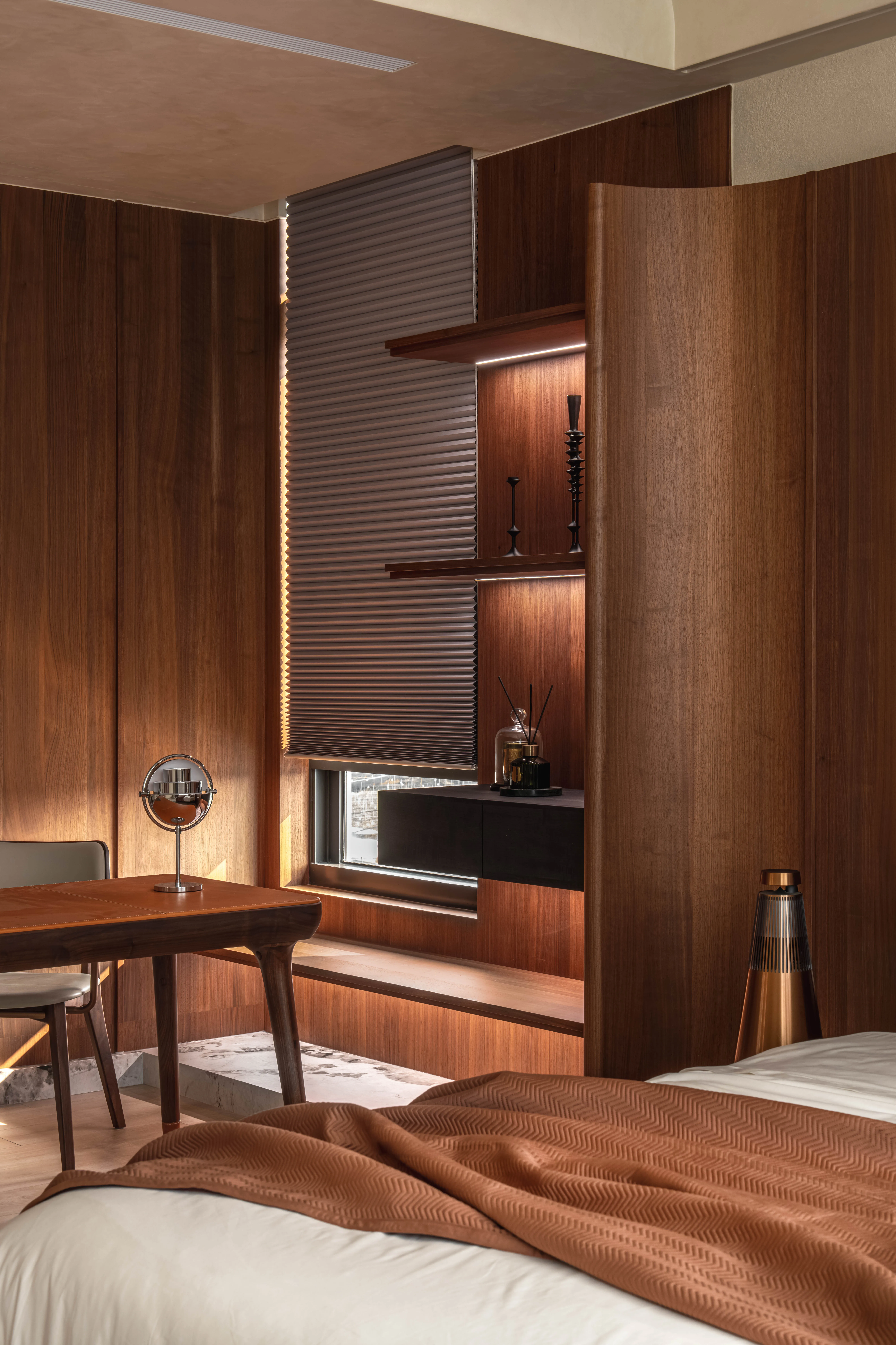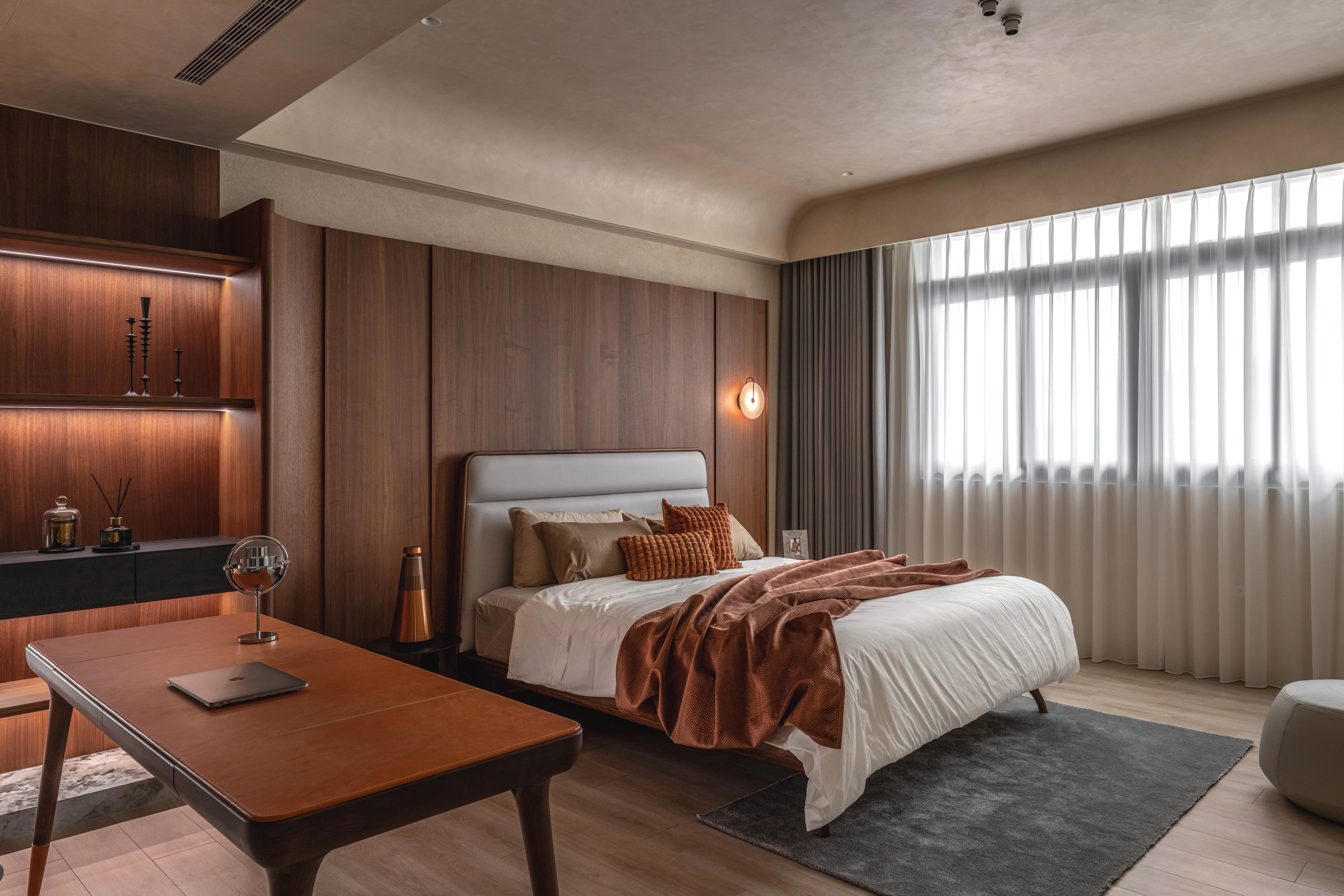 臥床區被一隅弧形木皮環抱,柔和線條象徵歇息時的安穩與靜謐,奢石薄板與塗料在光影交織下,以自然流動的韻律,推疊出低調而豐富的層次