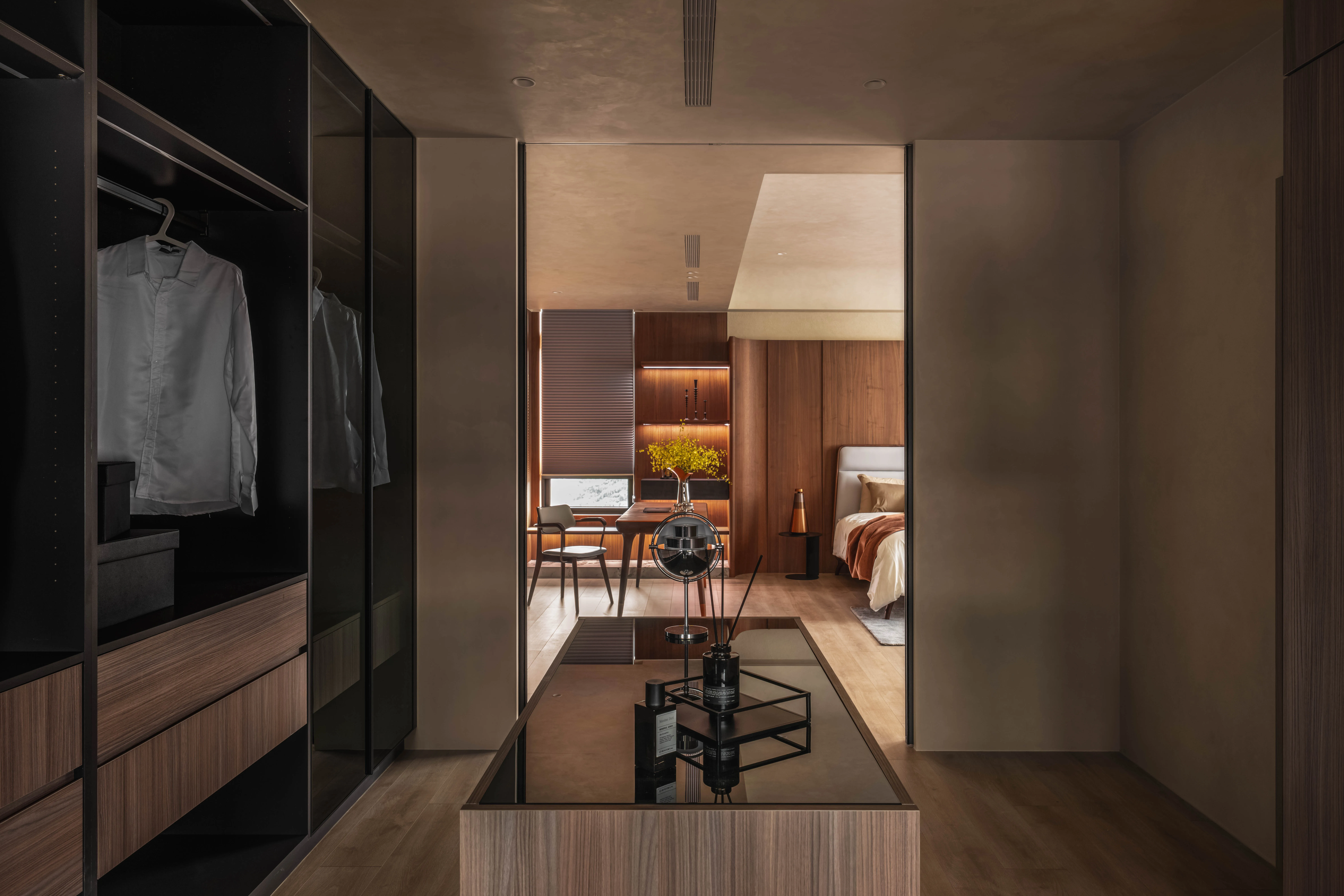 更衣室與衛浴隱身於門後,留下一段剛好的距離,讓書桌前的閱讀與日常在視覺與動線中保持從容,時間,也在此停留