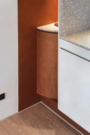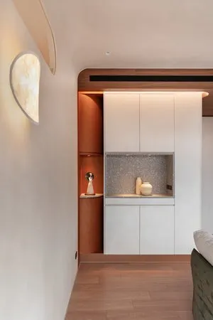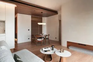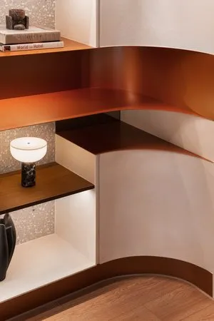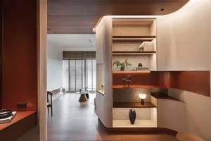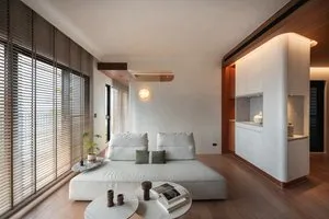 設計配置解構了原有框架,刻意的將動線關係淡化,藉由一座弧形空間屏風,轉換場域,釋放了公領域的流動感。